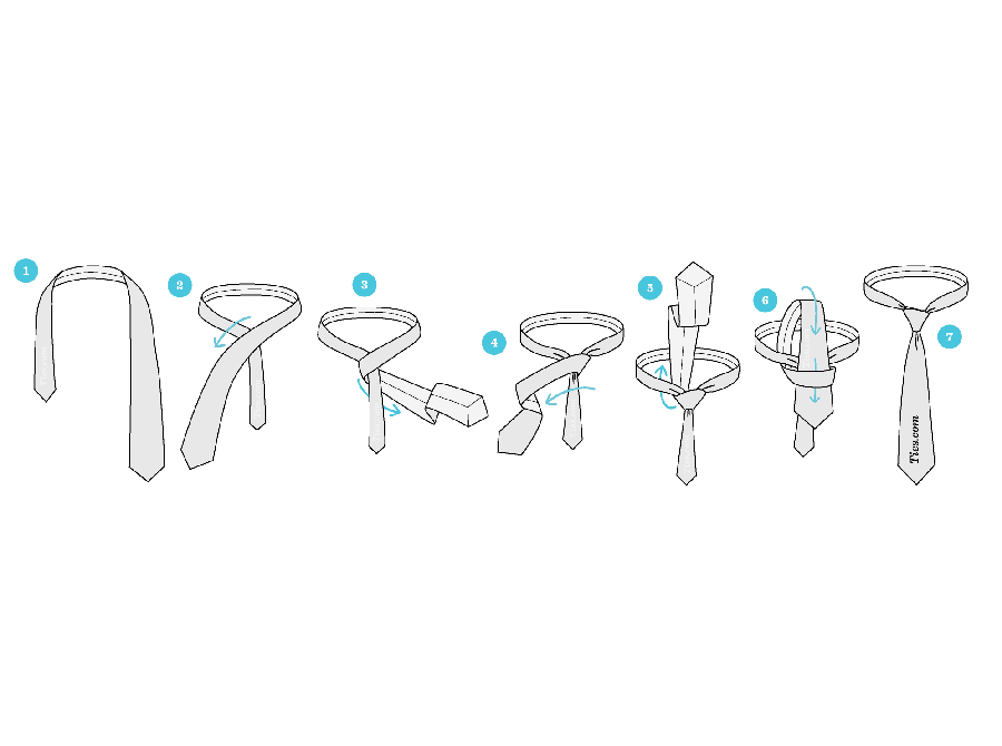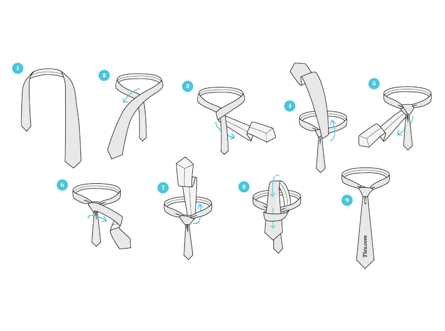 کراوات را دور گردن خود بیندازید تا ارتفاع قسمت پهن‌تر حدود ۳۰ سانتی متر شود. انتهای پهن را از روی انتهای باریک عبور دهید و از داخل سوراخ ایجاد شده رد کنید. سپس انتهای پهن را از چپ به راست روی قسمت باریک بیاورید و همین مرحله را تکرار کنید. درنهایت انتهای پهن‌تر را از روی گره رد کنید و گره کراوات را در جای خود محکم کنید.