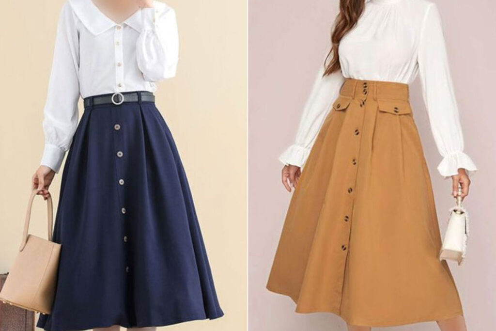 • فرم بدن گلابی: اگر پایین‌تنه بزرگ‌تری نسبت به بالاتنه دارید، دامن‌های کلوش یا دامن‌هایی با جزئیات در قسمت بالایی انتخاب خوبی هستند. این مدل‌ها به ایجاد تناسب بین بالاتنه و پایین‌تنه کمک می‌کنند.